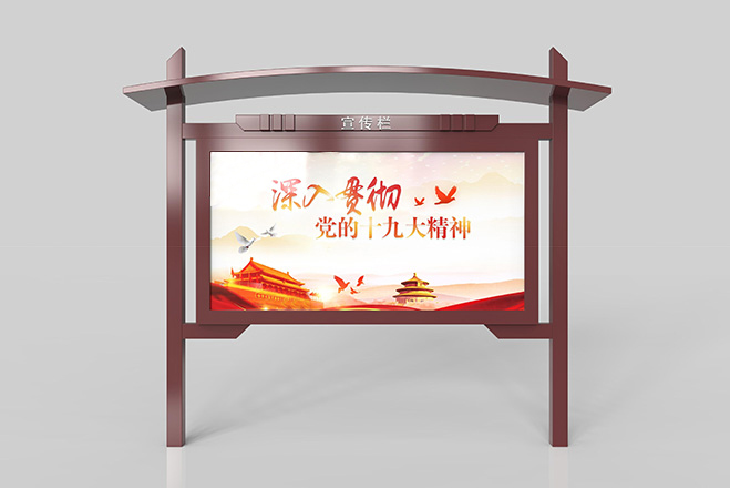 宣傳欄是一種VI應(yīng)用,是組織或企業(yè)單位等進行自我宣傳的有效手段,常被應(yīng)用于街道,工廠等公共場所;一般采用不銹鋼為框架,鋼化玻璃或者耐力板為面板,鋁合金為頂棚,面板可以打開更換宣傳畫面。現(xiàn)如今,宣傳欄廣泛應(yīng)用于學(xué)校、小區(qū)、會議館、展廳等各個場地。